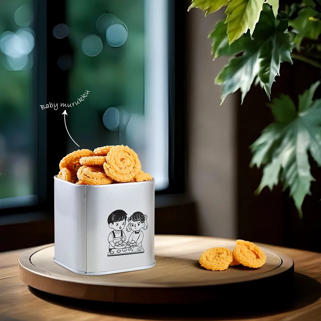 Baby Murukku, also known as mini murukku, are tiny spiral-shaped snacks made from rice flour, ghee, and gentle spices. Their small size makes them perfect for portion control, kids’ snacks, or party servings. Each piece delivers a crisp, savory experience that melts in your mouth.